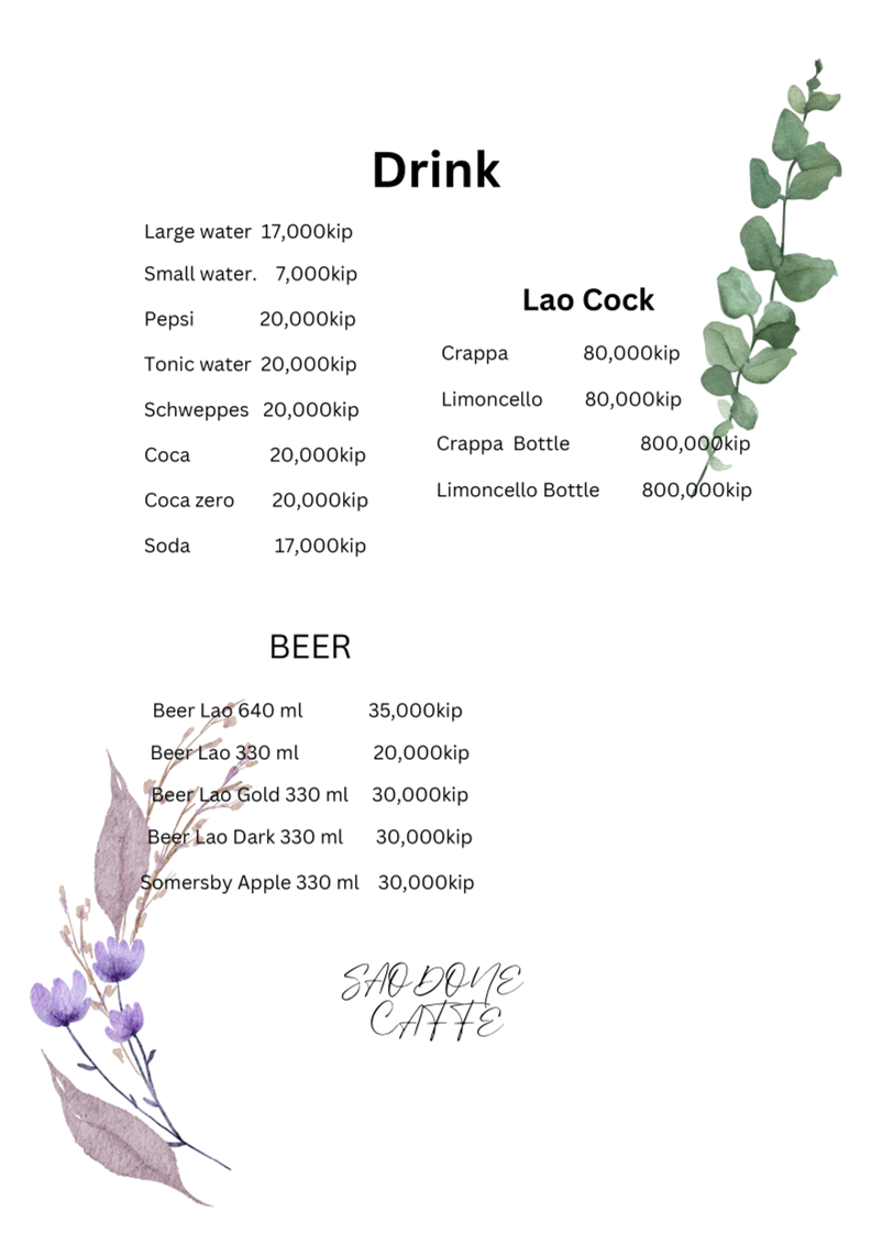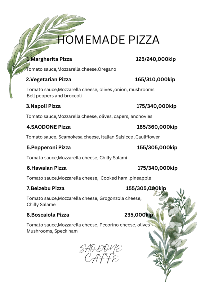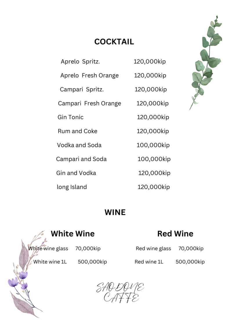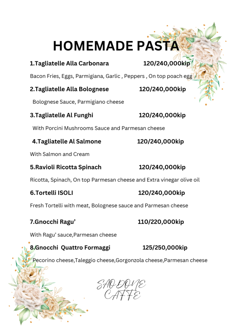 Saodone Italian Restaurant offers a delightful array of Italian dishes that are both satisfying and flavorful. The menu showcases various types of pasta, each made with fresh ingredients to guarantee authenticity. For example, the Ravioli Ricotta stands out with its rich filling, offering a perfect balance of textures and flavors. Another highlight is the Pasta with Mixed Vegetables served with a delicate sauce, ideal for vegetarians or anyone craving a lighter option. As for the prices, the dishes are reasonably priced, with items like the Pasta with Mixed Vegetables priced at ₭30,000, ensuring you can enjoy high-quality food without breaking the bank. The variety of choices, from hearty pastas to lighter fare, makes Saodone an excellent choice for those seeking an authentic taste of Italy in the heart of Laos. The menu is simple yet fulfilling, promising a memorable dining experience for all.