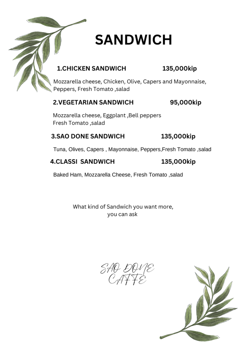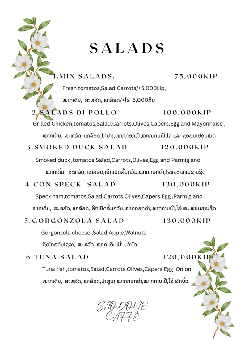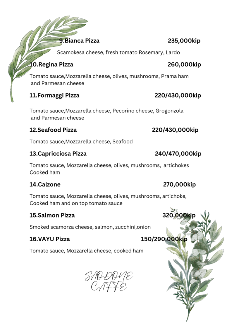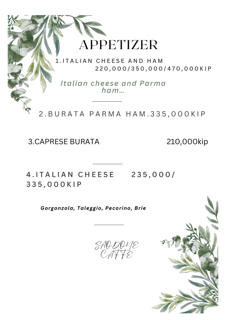 Saodone Italian Restaurant offers a delightful array of Italian dishes that are both satisfying and flavorful. The menu showcases various types of pasta, each made with fresh ingredients to guarantee authenticity. For example, the Ravioli Ricotta stands out with its rich filling, offering a perfect balance of textures and flavors. Another highlight is the Pasta with Mixed Vegetables served with a delicate sauce, ideal for vegetarians or anyone craving a lighter option. As for the prices, the dishes are reasonably priced, with items like the Pasta with Mixed Vegetables priced at ₭30,000, ensuring you can enjoy high-quality food without breaking the bank. The variety of choices, from hearty pastas to lighter fare, makes Saodone an excellent choice for those seeking an authentic taste of Italy in the heart of Laos. The menu is simple yet fulfilling, promising a memorable dining experience for all.